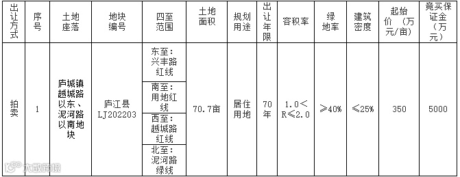 根据《中华人民共和国土地管理法》、《中华人民共和国城市房地产管理法》、《招标拍卖挂牌出让国有建设用地使用权规定》(国土资源部第39号令)、《关于进一步促进我市房地产市场平稳健康发展的若干意见的通知》(合政办〔2016〕43号)、《合肥市国有建设用地使用权网上交易规则(试行)》等相关规定,经合肥市土地管理委员会批准,庐江县自然资源和规划局决定出让下列国有建设用地使用权。现将有关事项公告如下: