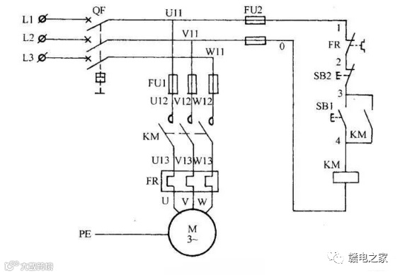主回路(一次回路)常见符号:L表示电源;QF断路器;U、V、W负载相序;FU保险;FR热继电器;M电动机;PE接地保护。