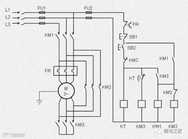 控制逻辑解析:启动顺序,按下SB2、KM1、KM3、KT吸合,电动机M进入星型运行状态。同时KT进入延时断开状态,时间到达后KT断开KM 3,KM3长闭触点复位后,KM2得电、KM2线圈吸合后,进行了端子合并。电动机M由星型转为三角形运行。