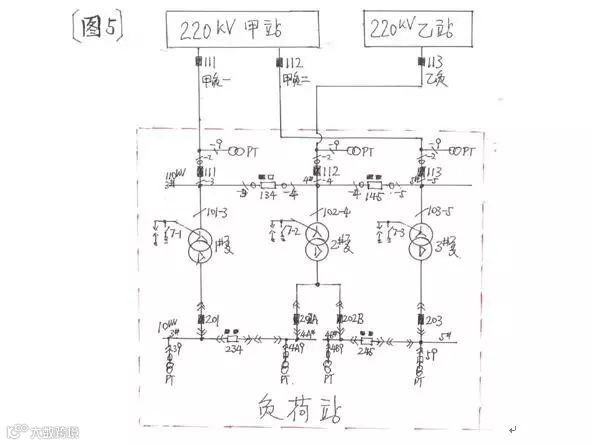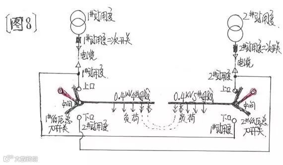 中间位置是0.4kV5#母线负荷停电;由于其特殊的接线方式,1#站用变与2#站用变0.4kV侧的主回路不可能“并列”,但其0.4kV负荷的几个“交流环路”应当防止将1#站用变与2#站用变0.4kV侧“并列”。