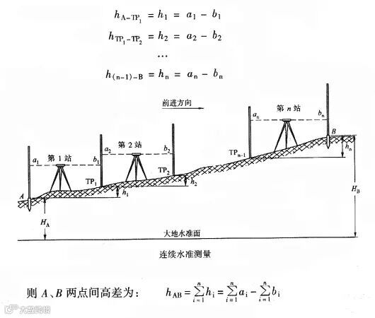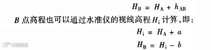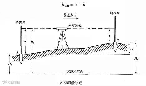 设水准测量的前进方向为A点至B点,则称A点为后视点,其水准尺读数a为后视读数;称B点为前视点,其水准尺读数b为前视读数。因此,两点间的高差等于:hAB=后视读数-前视读数。