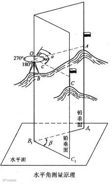 水平角是指过空间两条相交方向线所作的铅垂面间所夹的二面角,角值为 0°~360°。空间两直线OA和OB相交于点O,将点A,O,B沿铅垂方向投影到水平面上,得相应的投影点A′,O′,B′,水平线O′A′和O′B′的夹角β就是过两方向线所作的铅垂面间的夹角,即水平角。