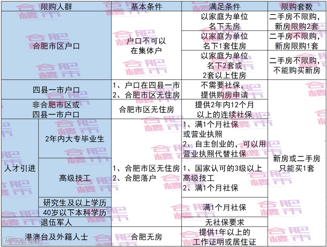 与购房资格相关的人才落户方面,研究生以上学历、40岁以下本科生、毕业2年内的大专生、中级及以上专业技术人员、高级技工、国家职业资格三级及以上高技能人才可以办理人才落户,外加1个月社保就可以在合肥买房。