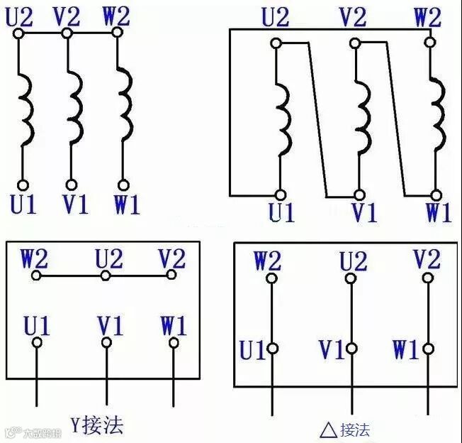 三角形△接法就是将三个绕组首尾端依次相连,构成三角形。如图所示接法:
