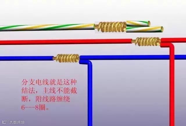 这是线路中有外接电源时的接法,它能够保证电线接头不发生打火、短路,与接触不良的现象。分支线路接主线路时,主线路不能截断,附电线围绕主线缠绕6--8圈。