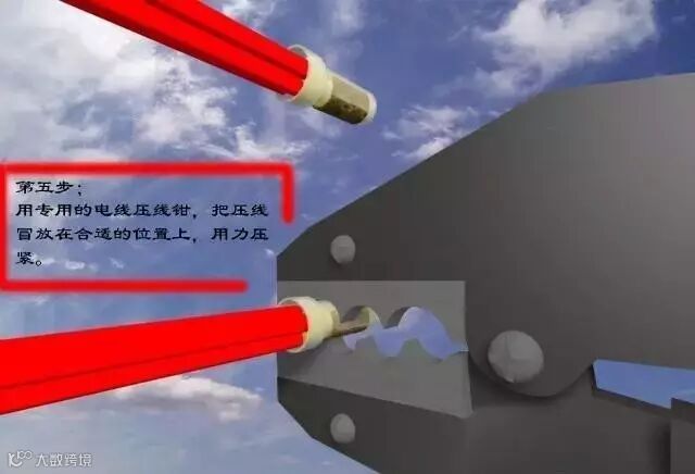 下面是第三种接法,就是压线冒接线法。这种方法是最规范和最实用的,但是它需要专用工具来做,压线冒的压线钳来压线,把压电线用的专用钳子,套在压线冒上,用力压紧就行了。