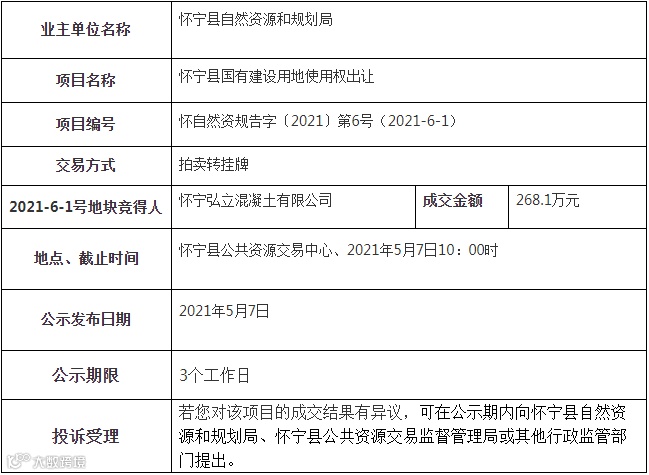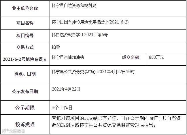 安庆市2宗土地使用权成功出让。位于石牌镇庆州村的工业用地使用权由怀宁弘立混凝土有限公司竞得。位于铺镇金鸡村,S360省道西侧的商服用地使用权由怀宁县洪铺加油站竞得。