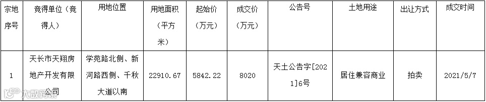 滁州市天长市学苑路北侧、新河路西侧、千秋大道以南TP20216号地块使用权由天长市天翔房地产开发有限公司竞得,规划用途为居住兼容商业用地。