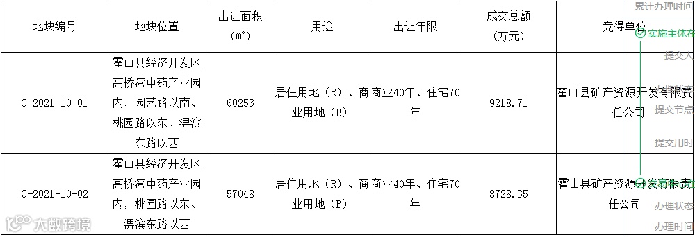 六安市霍山县3宗土地使用权成功出让。位于经济开发区高桥湾中药产业园内的2宗居住用地(R)、商业用地(B)使用权由霍山县矿产资源开发有限公司竞得。