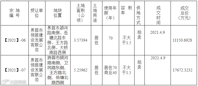阜阳市界首市2宗居住用地使用权均由界首市恒居建设发展有限公司竞得。