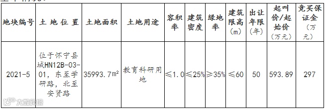 怀宁县城学研路与安贤路交口西南的2021-5号地块用途为教育科研用地,面积约54亩,挂牌截止日期为3月30日。