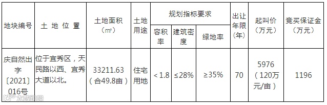 安庆市将出让位于宜秀区,天民路以西、宜秀大道以北的庆自然出字〔2021〕016号地块,规划用途为住宅用地。
