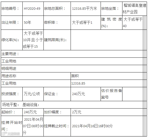 位于榴城镇高皇建材产业园的HY2020-49号地块面积约12316.85㎡,规划用途为工业用地。