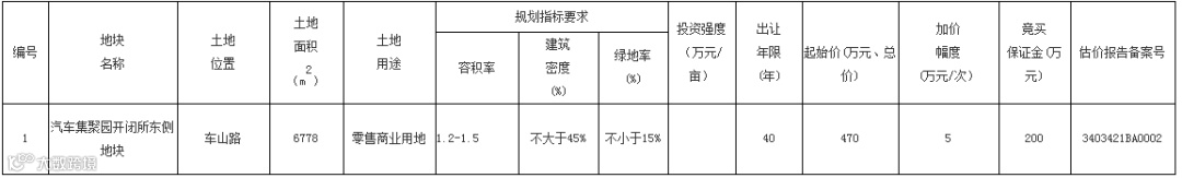 池州市拟挂牌出让位于车山路的汽车集聚园开闭所东侧地块,规划用途为零售商业用地,面积约6778㎡。
