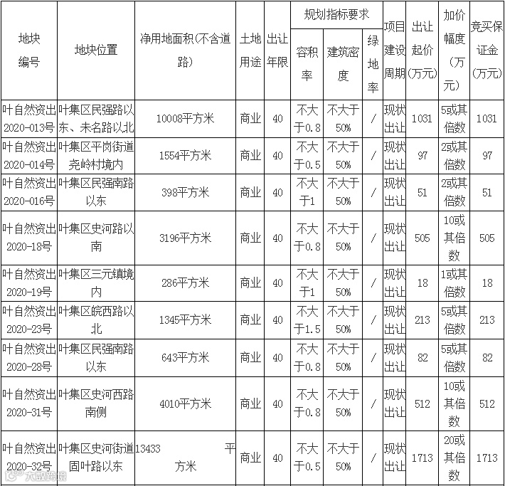 六安市自然资源金和规划局叶集分局拟出让11宗土地使用权,其中10宗为商业用地,1宗为工业用地。