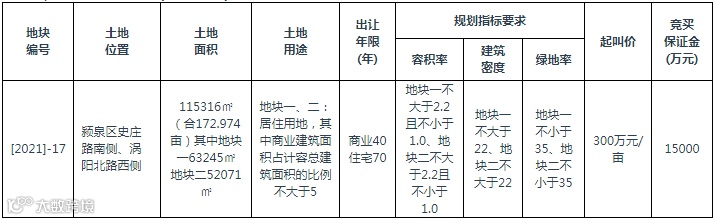 阜阳市将拍卖出让颍泉区史庄路南侧、涡阳北路西侧[2021]-17号地块使用权,规划用途为居住用地,其中商业建筑面积占计容总建筑面积的比例不大于5。申请人可于5月31日到6月22日提交书面申请。
