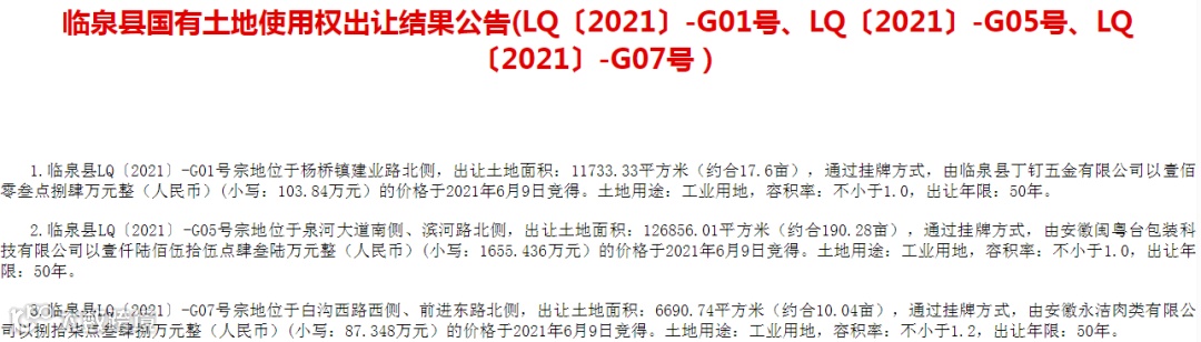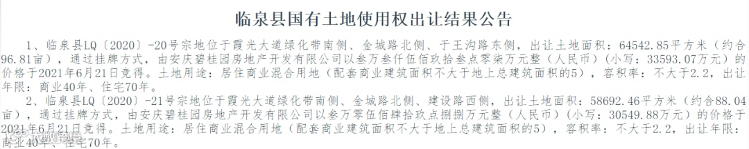 阜阳市临泉县5宗土地使用权成功出让,其中,霞光大道绿化带南侧、金城路北侧2宗居住商业混合用地使用权由安庆碧桂园房地产开发有限公司竞得。