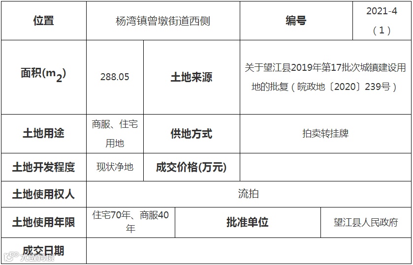 安庆市望江县杨湾镇曾墩街道西侧2021-4(1)号地块使用权出让方式由拍卖转挂牌,规划用途为商服、住宅用地。
