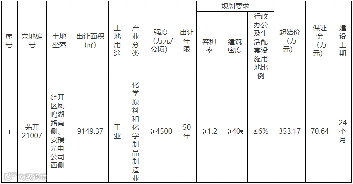 芜湖市将挂牌出让经开区凤鸣湖路南侧、安瑞光电公司西侧芜开21007号地块使用权,规划用途为工业用地。申请人最迟可于6月9日提交书面申请。