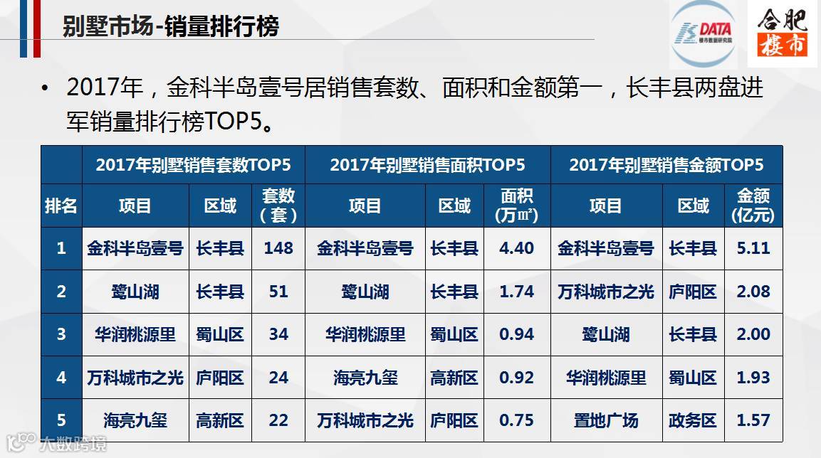 2017年,合肥别墅市场明显供不应求;长丰县的金科半岛壹号别墅销量居九区三县榜首,共计148套/4.4万㎡。