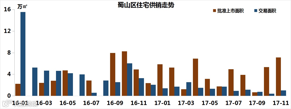 受限购的影响,从去年10月开始,蜀山区的成交量持续下跌;2017年蜀山区共新增商品住宅4550套/46.21万㎡,成交量共1490套/14.49万㎡,市场明显供大于求。