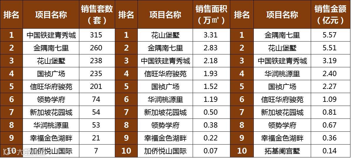 其中,中国铁建青秀城销售套数最多,共计315套/2.18万㎡,花山堡墅销售面积最多,共计238套/3.31㎡,而金隅南七里的销售额最多,共计5.57亿元。