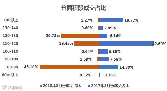 从分面积段成交来看,80-90㎡之间的房源成交占比46.18%,是绝对的主力销量户型。其次是120-130㎡以上的房源,占比29.78%。