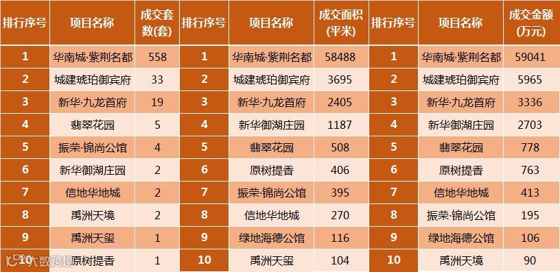 2018年8月,华南城紫荆名都以558套/58488㎡/59041万元的销售额同时居销售套数、销售面积和销售金额榜首;城建琥珀御宾府紧随其后。