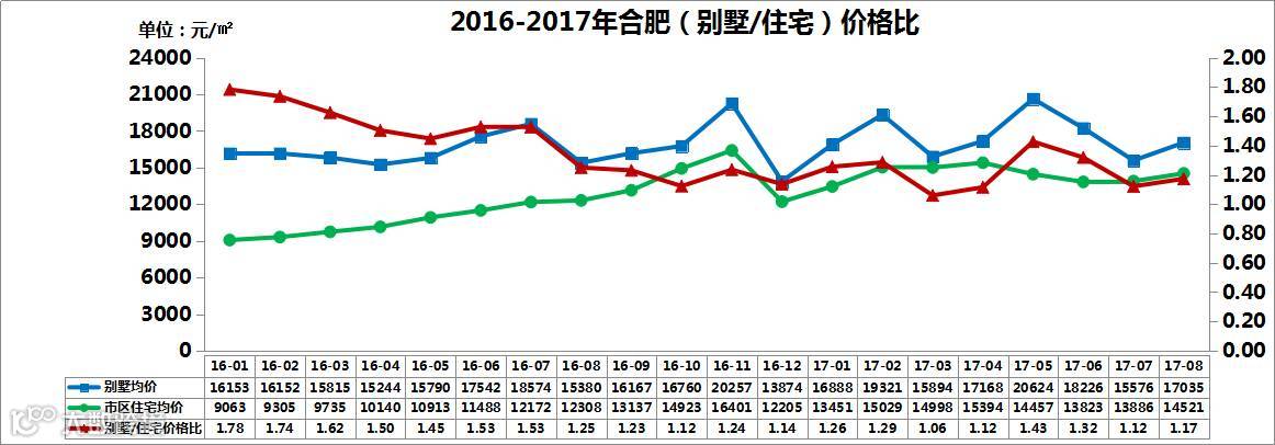 8月合肥别墅/住宅的价格比微涨为1.17,一方面,别墅均价有所上涨,均价为17035元/㎡,环比涨9.37%;另一方面,市区商品住宅整体均价有所回升,房价为14521元/㎡,环比微涨4.57%;市区商品住宅的均价环比增速小于别墅均价的环比增速,故8月份合肥别墅/住宅价格比有所上涨。
