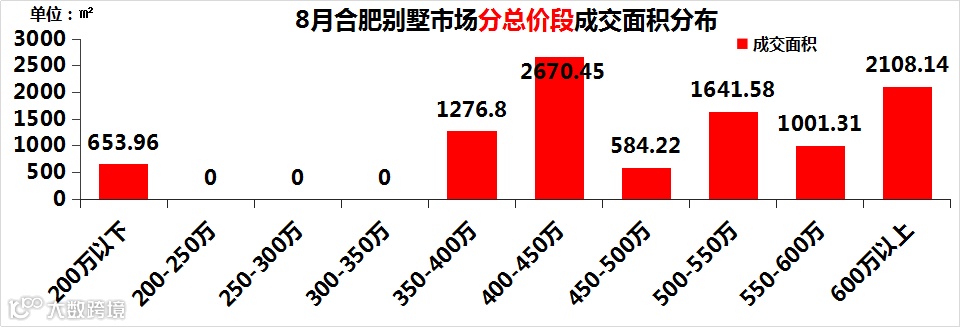 2、从分总价段成交来看,总价400-450万元的户型成交面积最多,共计2670.45㎡,其次是600万元以上的价段,成交面积为2108.14㎡;总价在200-350万元之间的别墅没有成交量。