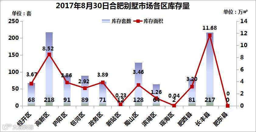 目前,长丰县的别墅库存量最高,为217套/11.68万㎡;肥东县的库存为0。