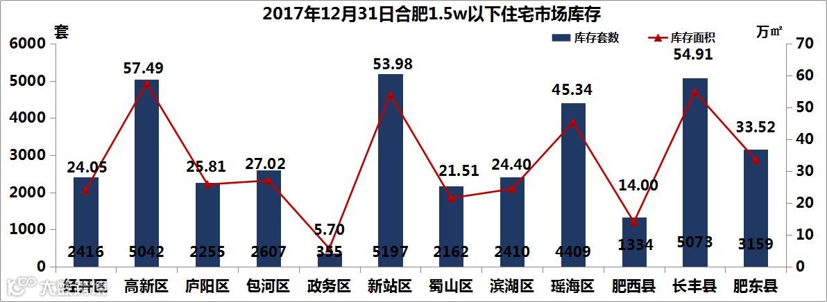 截止到2017年12月31日,合肥均价1.5w以下的商品住宅库存量为36419套/387.74万㎡,其中新站区库存套数最高,共计5197套,而高新区的库存面积最高为57.49万㎡。