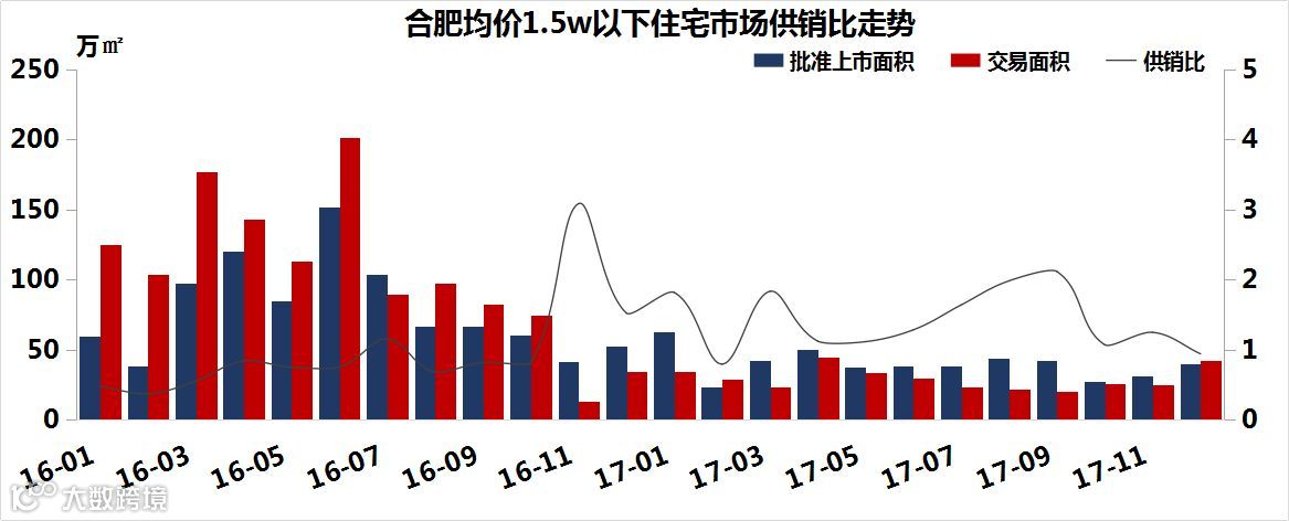 2017年,合肥共新增46521套/477.51万㎡均价1.5w以下的住宅,成交量共计35173套/353.76万㎡。