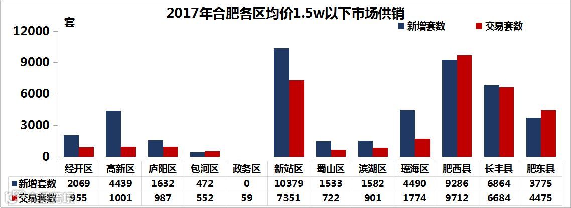 2017年,合肥均价1.5w以下的住宅市场,新增套数前三的区域分别是新站区、肥西县和长丰县,其中政务区没有新增商品住宅。