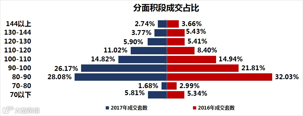 2017年,从分面积段来看,合肥均价1.5w以下的商品住宅市场以80-100㎡的住宅为成交的主力,成交占比54.25%,比2016年增加了0.41%。