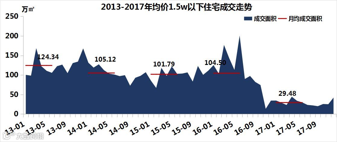由于限购政策和分级备案等原因,合肥1.5w以下的商品住宅成交量也大幅减少,2017年月均销量仅29.48万㎡。