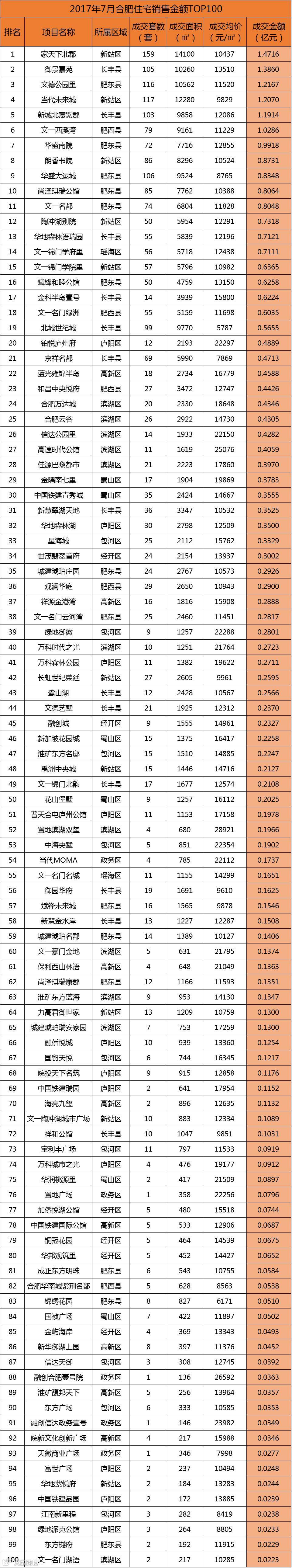 从销售金额来看,新站区的家天下北郡居成交金额排行榜榜首列,共计1.4716亿元;TOP10排名榜上,肥东县进军4盘,新站区3盘,长丰县2盘,剩下1盘是肥西县的文一西溪湾。