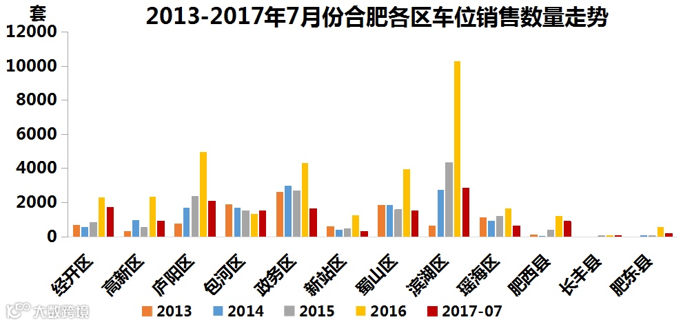 2016年合肥平均一个月销售车位2853个,2017年1-7月份月销售速度下降到2053个/月。