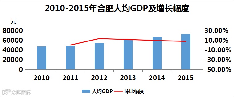 2010-2015年6年期间,合肥市GDP总量逐渐增长,到了2015年合肥GDP已经达到5660.27亿元,同比增长9.26%。人均GDP也在不断增长中,2015年人均GDP已经到达73102元,同比增长8.00%。