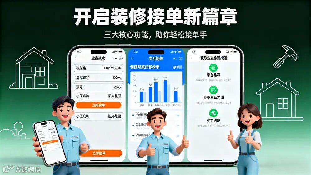 1. 装修接单宝App:移动阳光房专属派单。定向推送别墅庭院阳光房定制、露台移动阳光房安装订单,标注尺寸、风格需求,直接对接业主。
