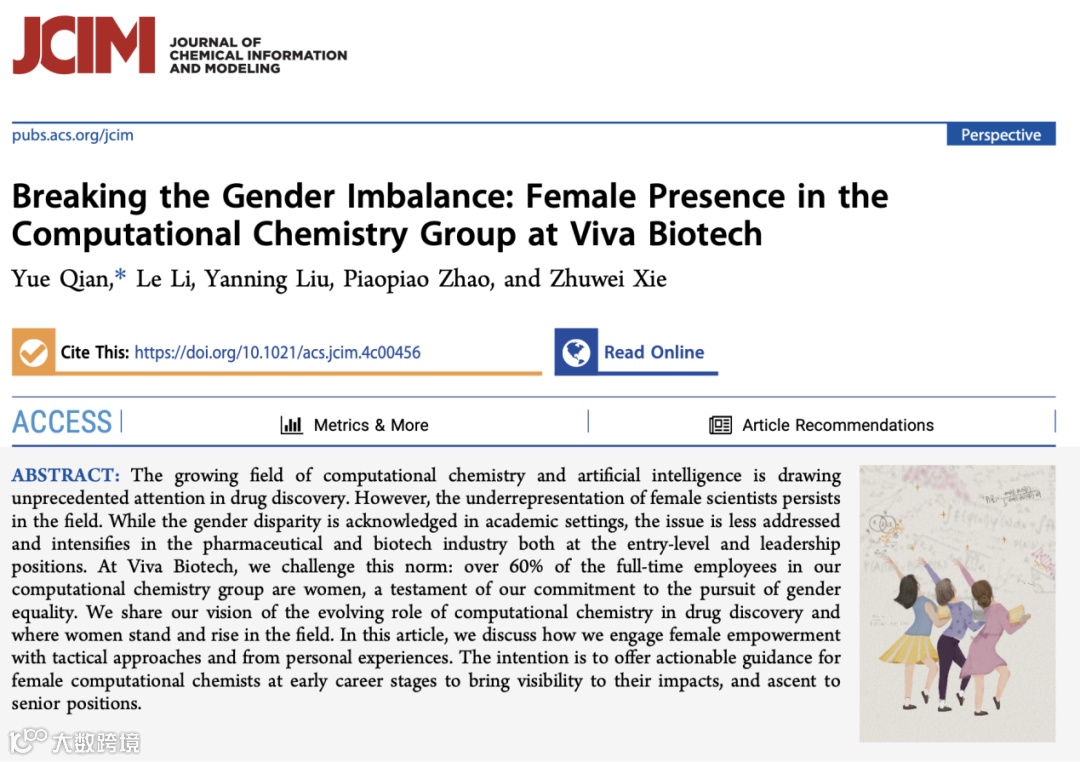 近期,维亚生物在美国化学协会(ACS)期刊Journal of Chemical Information and Modeling(JCIM)上发表了题为《Breaking the Gender Imbalance: Female Presence in the Computational Chemistry Group at Viva Biotech》的文章,维亚生物计算化学及人工智能平台执行主任钱玥博士担任第一作者,强调了计算化学及人工智能在药物发现中日益重要的作用,以及女性科学家在这一领域做出的杰出贡献。文章从组员的个人经历出发,探讨了女性如何有效地在工作中提高影响力,鼓励更多女性投身到热爱的事业当中去。
