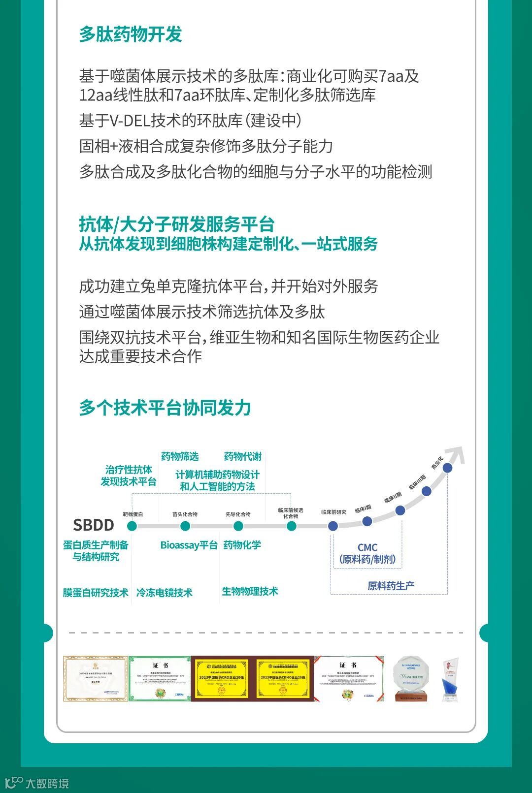 维亚生物( 01873. HK )成立于 2008 年,向全球创新药研发企业提供从早期基于结构的药物研发到商业化药物生产的一站式综合服务。凭借在基于结构的药物研发(SBDD)技术领域的领先优势,我们向全球合作伙伴提供新药研究阶段的CRO服务,搭建了X射线蛋白晶体技术、冷冻电镜技术(Cryo-EM)、亲和力质谱筛选技术(ASMS)、表面等离子共振技术(SPR)、氢氘交换质谱技术(HDX-MS)、计算机辅助药物设计等多个先进技术平台,并有资深药物化学家与药物发现生物专家领军的团队提供药物设计、药物化学(H2L,LO)、化合物合成、化学分析及纯化、公斤级放大及多肽合成及相应的生物活性测试服务。通过子公司朗华制药,我们提供从临床前开发到商业化生产的一站式CMC/CDMO解决方案。同时,我们专注于发现、投资高潜力生物医药初创公司,以独创的技术服务换取股权(EFS)的商业模式,解决未满足的临床需求。