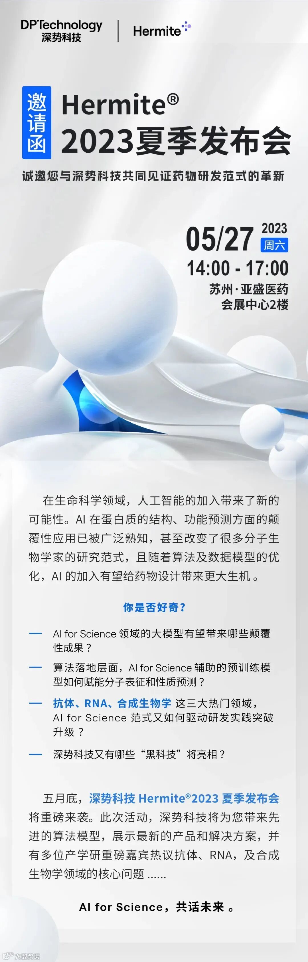 5月27日,深势科技 Hermite®2023 夏季发布会将重磅来袭。此次活动,深势科技将带来先进的算法模型,展示最新的产品和解决方案,并有多位产学研重磅嘉宾热议抗体、RNA,及合成生物学领域的核心问题 ......