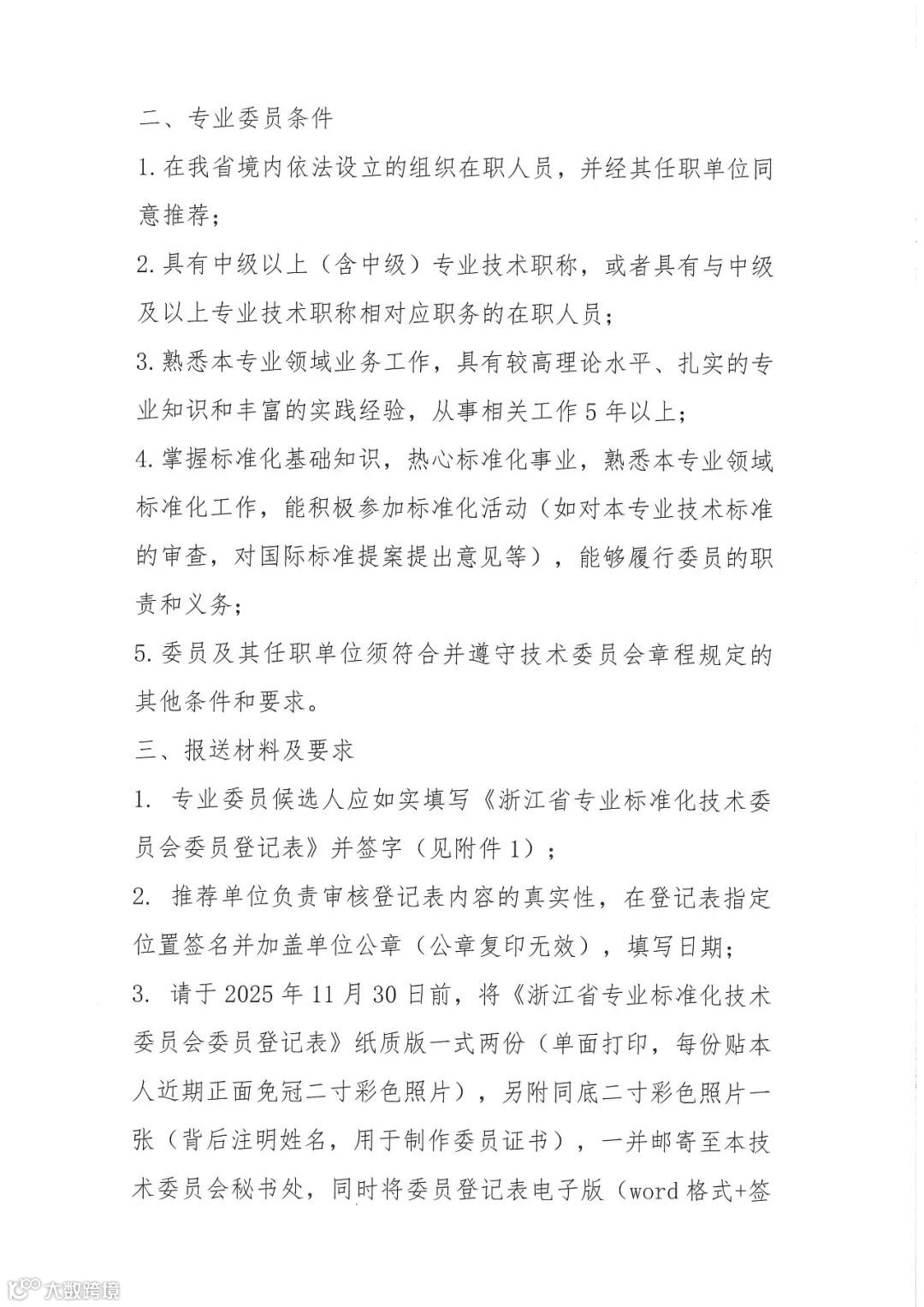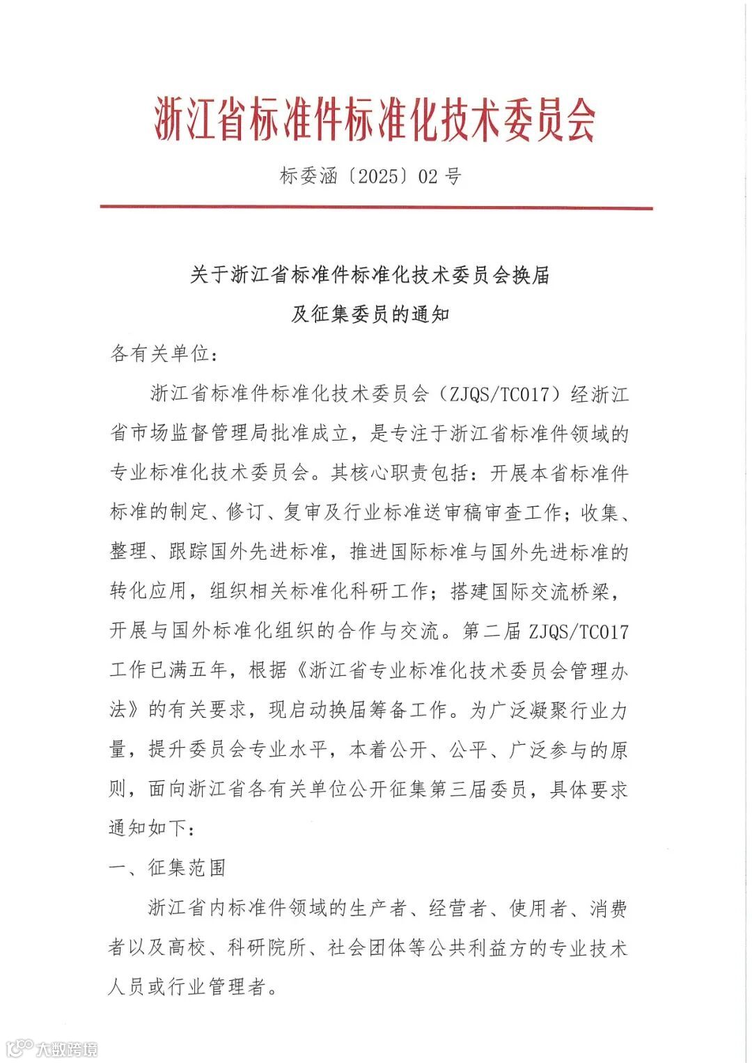 根据《浙江省专业标准化技术委员会管理办法》规定,浙江省标准件标准化技术委员会(ZJQS/TC017)现已启动换届工作,并面向全省公开征集第三届委员。欢迎浙江省内标准件领域相关生产者、经营者、科研院所、社会团体等单位的专业人才积极报名,共同推动我省标准件行业的标准化建设与发展。请有意向的单位和个人于2025年11月30日前按要求提交材料至秘书处。