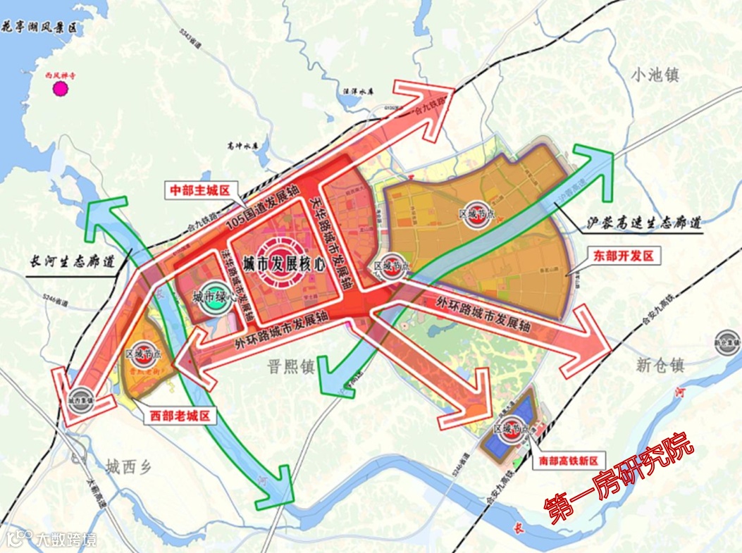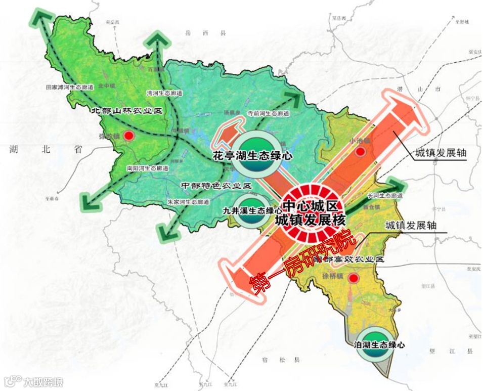 双轴:即依托县域主要交通廊道构建县域城乡联动发展轴,横向以沪渝高速、合安九高铁、合九铁路105国道为主要轴线,纵向以规划太薪高速、246 省道作为主要轴线,带动县域城镇健康有序发展。