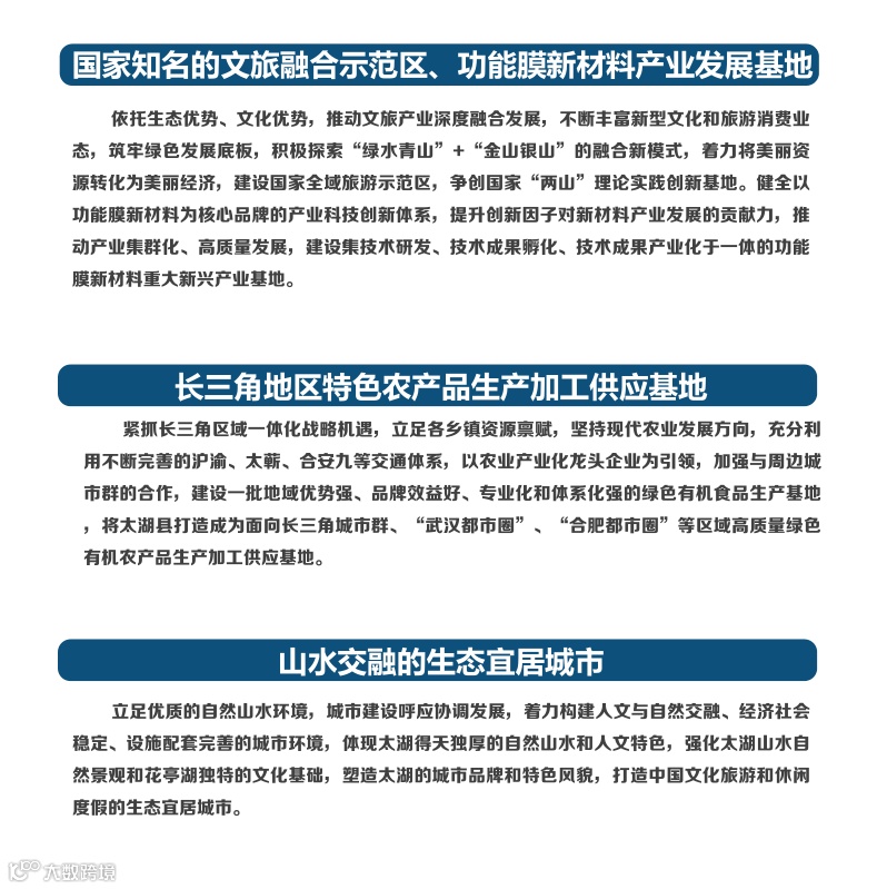 根据最新的城市规划可知,太湖的发展定位为国家知名的文旅融合示范区、功能膜新材料产业发展基地、长三角地区特色农产品生产加工供应基地、山水交融的生态宜居城市。