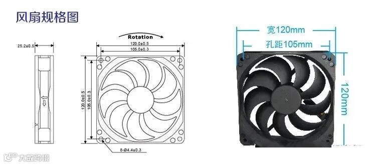 风扇的尺寸大小,一般以风扇外边长和产品厚度尺寸表示,单位为mm。