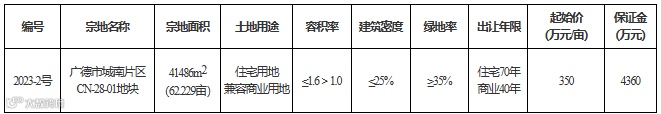 1、广德市2023-2号地块(广德市城南片区CN-28-01地块)位于广德市城南片区凤井路、熙春路、纬九路、健民路等围合范围。出让面积41486m2(约合62.229亩)。
