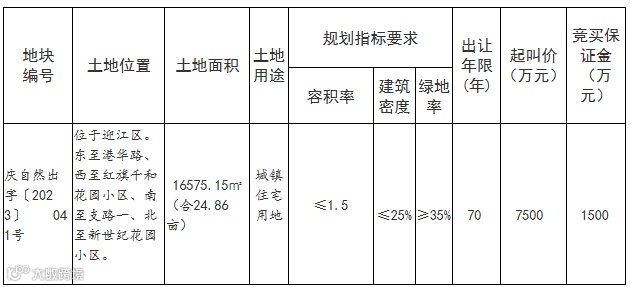 根据《中华人民共和国土地管理法》《中华人民共和国城市房地产管理法》《招标拍卖挂牌出让国有建设用地使用权规定》(国土资源部39号令)等法律、法规的规定,经批准,决定出让庆自然出字〔2023〕041号地块国有建设用地使用权。现将有关事项公告如下: