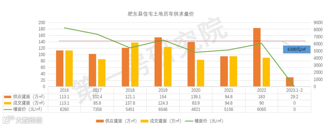 根据筋斗云AI楼市指数系统统计数据显示,肥东县近7年年均供应129.64万㎡,年均成交104.24万㎡,供应成交率80%;成交楼面价稳定在6300元/㎡ 左右。整体来看,土地市场成交量价相对稳定。